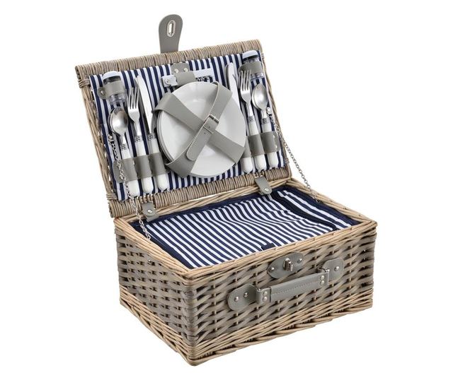 Picnic Basket for 4 People, 40 X 28 X 19 Cm, Wicker/Faux Leather/Textile, Gray/White