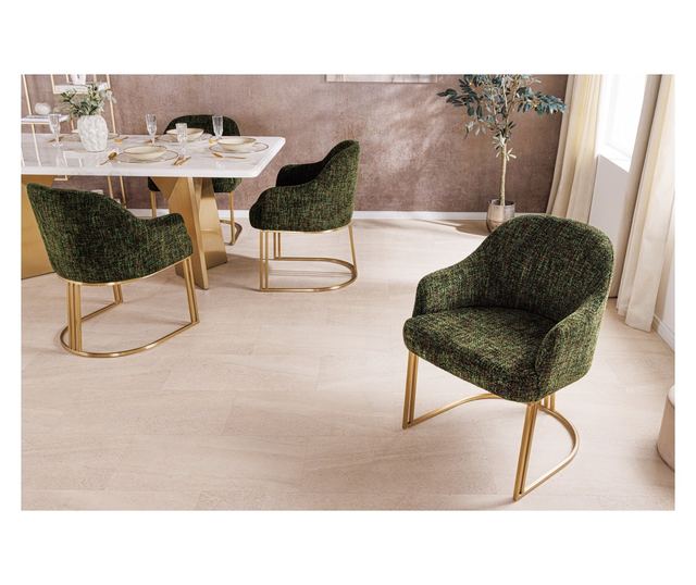 The Vstyle Irresistible 287995 chair combines comfort and style for any room. With a seat height of 80 cm and a depth of 57 cm, it's perfect for relaxing with a meal or a book. The dark green chenille fabric and champagne metal frame create an elegant look suitable for various interiors. It's also easy to clean – most stains can be removed with a damp cloth. This is a set of 2, and the price is for the set.