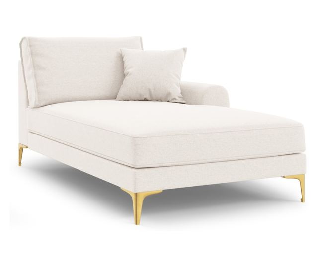 The Mazzini 840410 chaise lounge combines comfort and elegance. Designed for modern homes, this lounge offers both style and function. Its light beige color and gold metal legs add a touch of luxury to any room. The right-hand corner design helps you make the most of your space. The upholstery is made of durable and easy-to-clean structured fabric (Asgard/Positano). It comes with a decorative pillow filled with silicone. The lounge's dimensions are 90x182x102 cm, with a seat depth of 81 cm, a seat height of 46 cm, and armrests that are 62 cm high. The legs are 15 cm tall, and the lounge can hold up to 150 kg. It's the perfect place to relax and unwind.